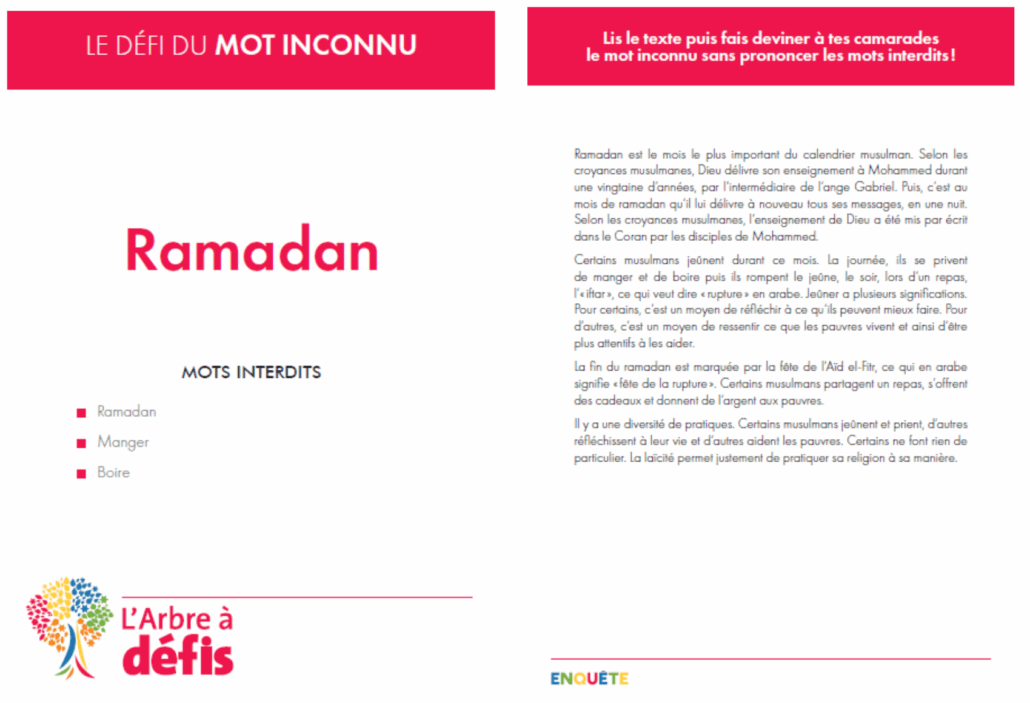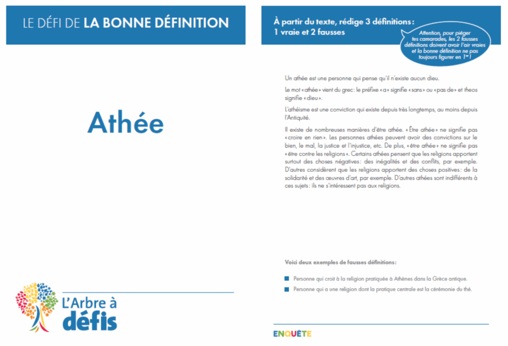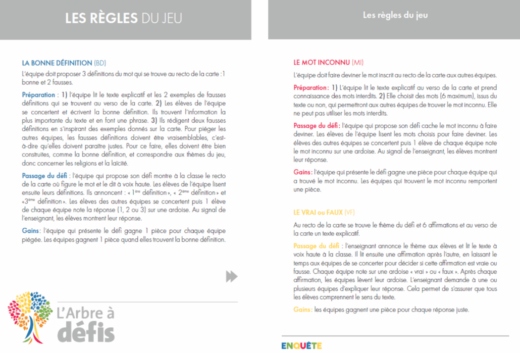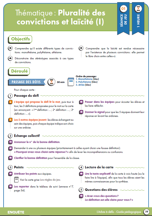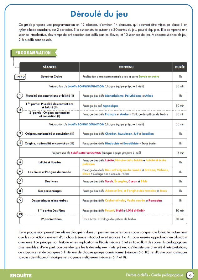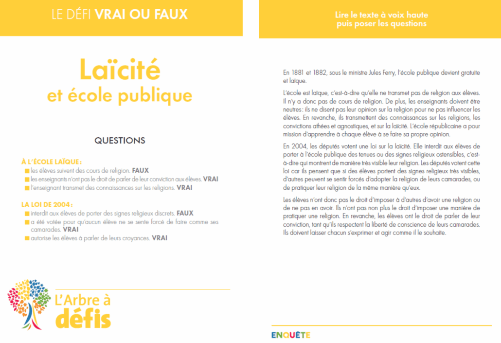 L’Arbre à défis est un outil d’éducation à la laïcité par l’enseignement des faits religieux pour les élèves de cycle 3. Ce jeu, conçu en cohérence avec les programmes, permet aux enseignants d’investir sereinement cet enseignement, en étant guidés pas à pas.